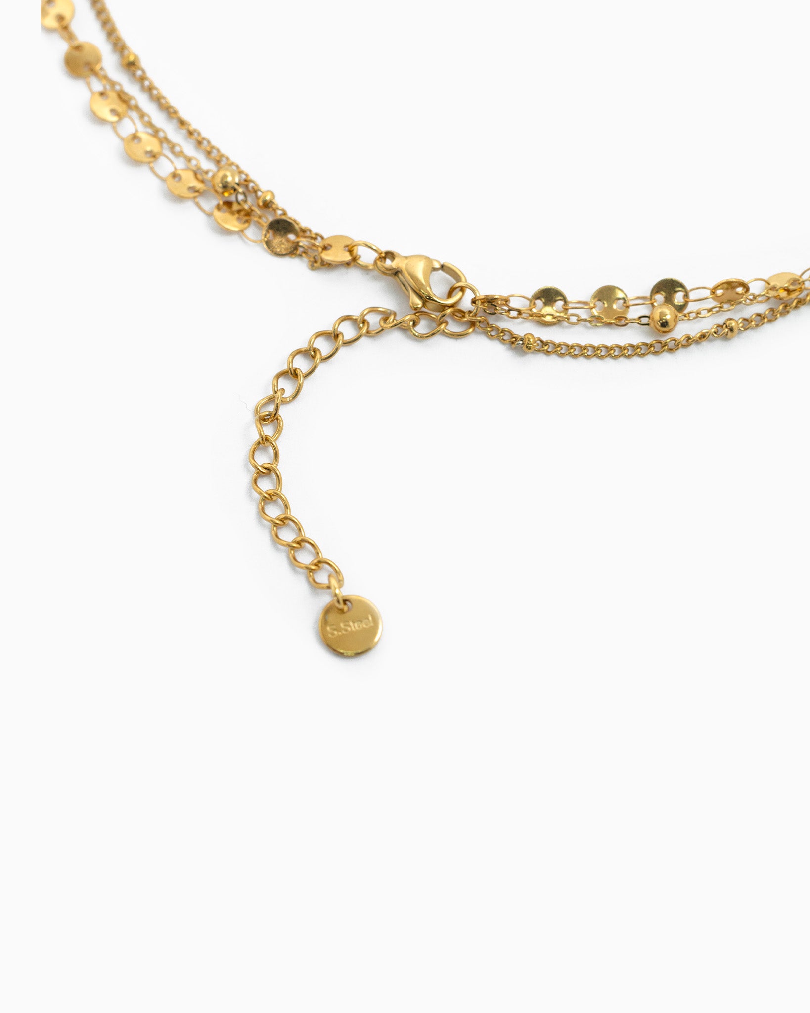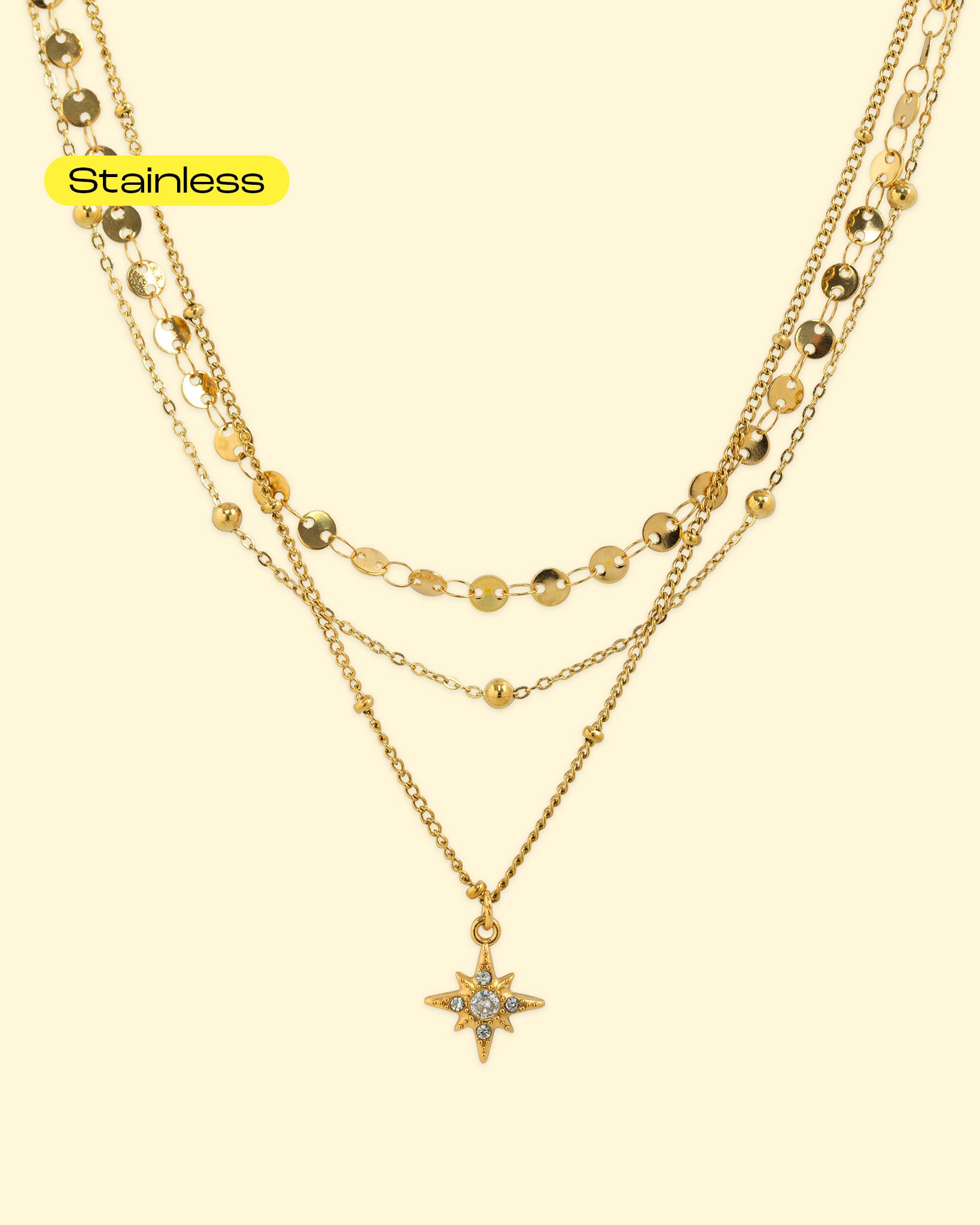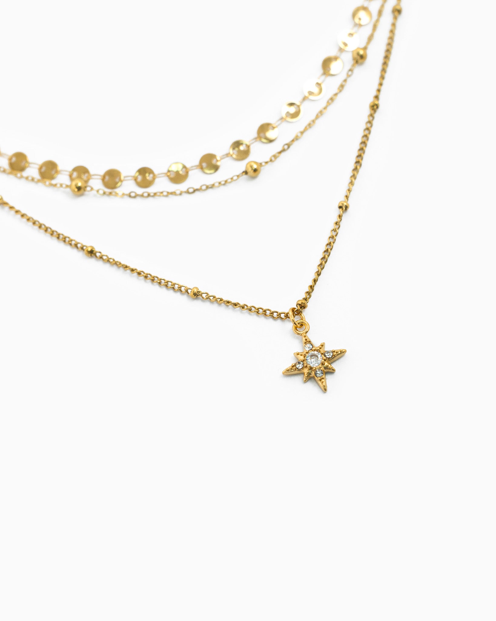 A refined layered necklace featuring three delicate chains accented with shimmering CZ details and a subtle star charm.