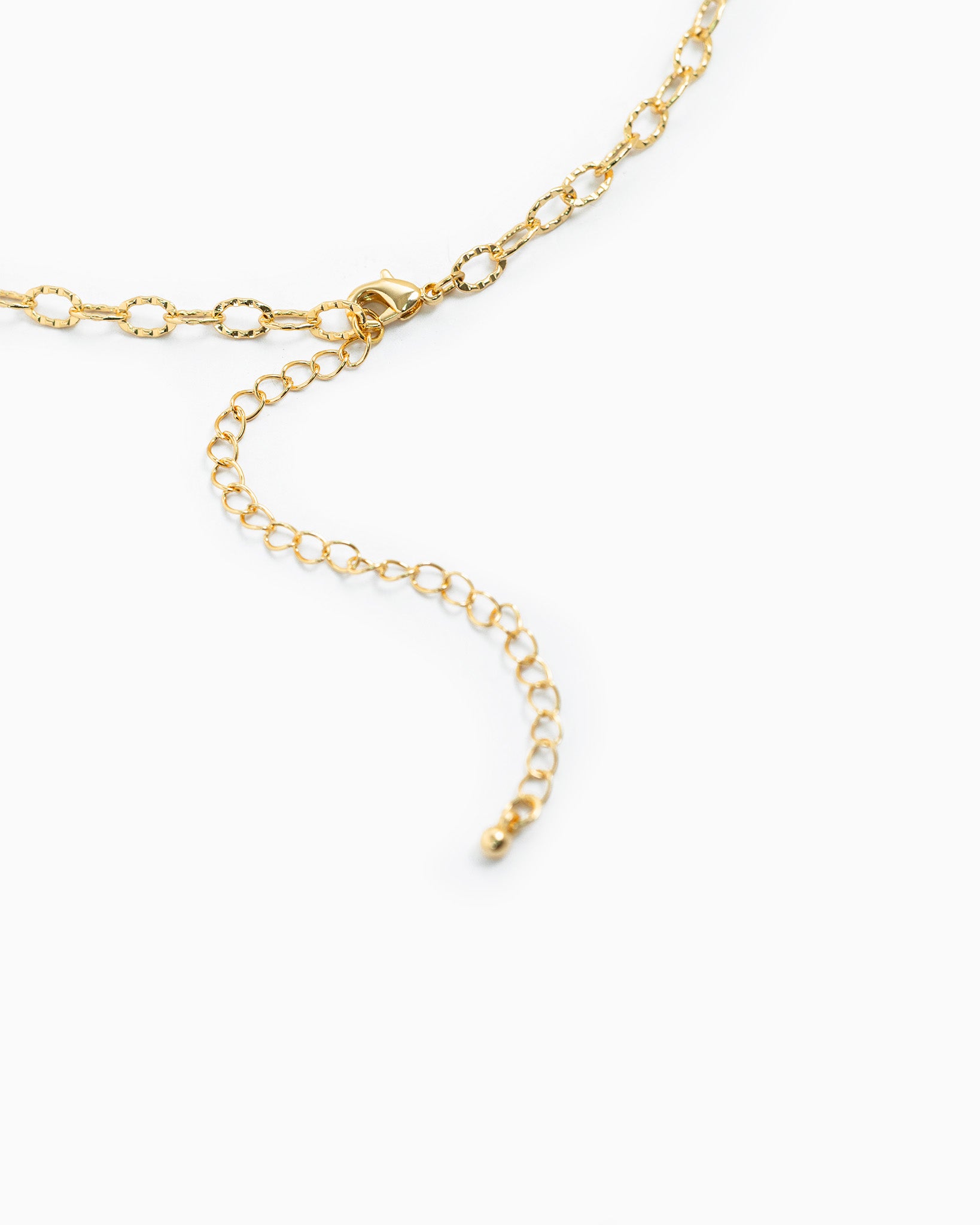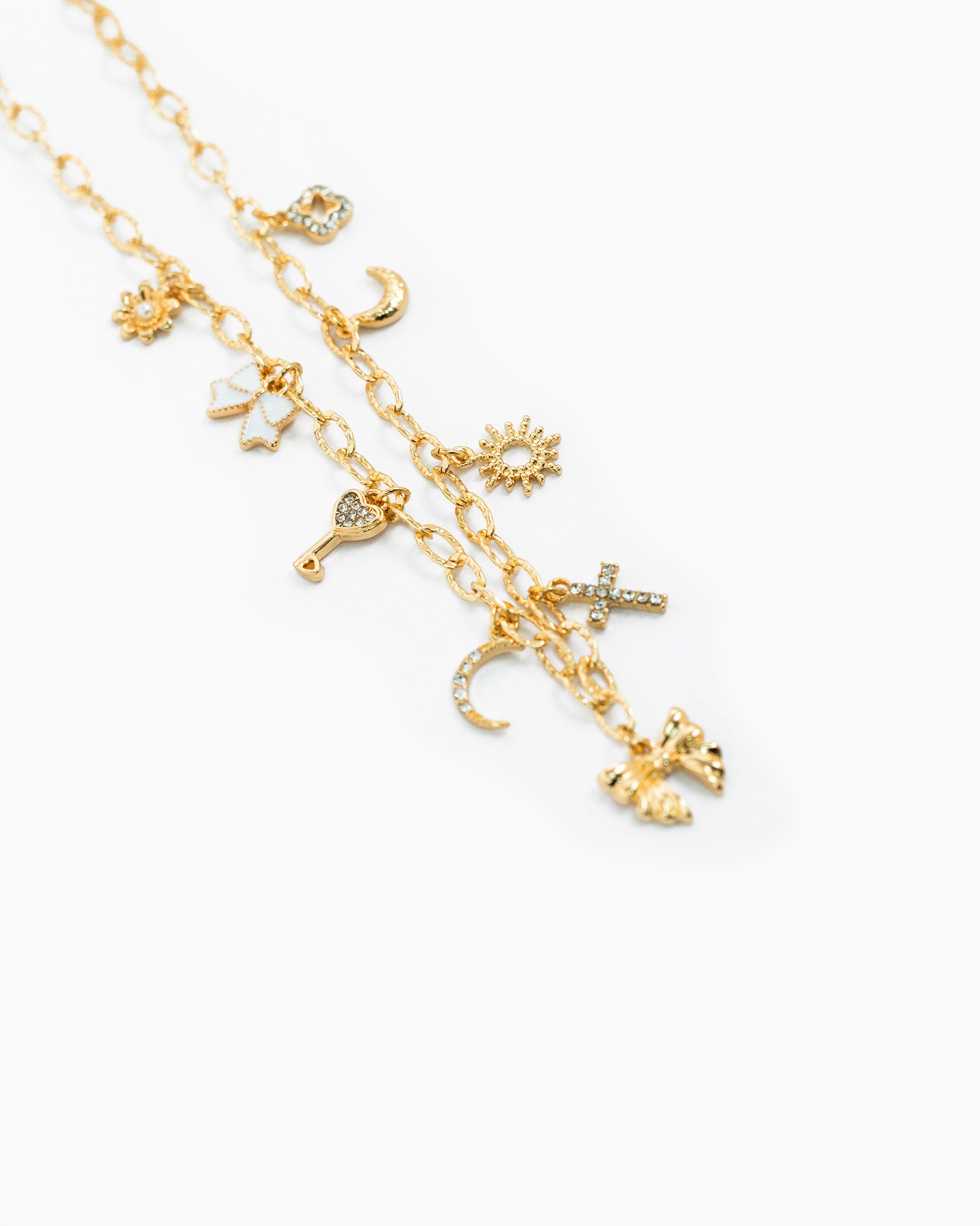 A whimsical charm necklace featuring a mix of symbolic motifs including a bow, cross, crescent moon, and sunburst.
