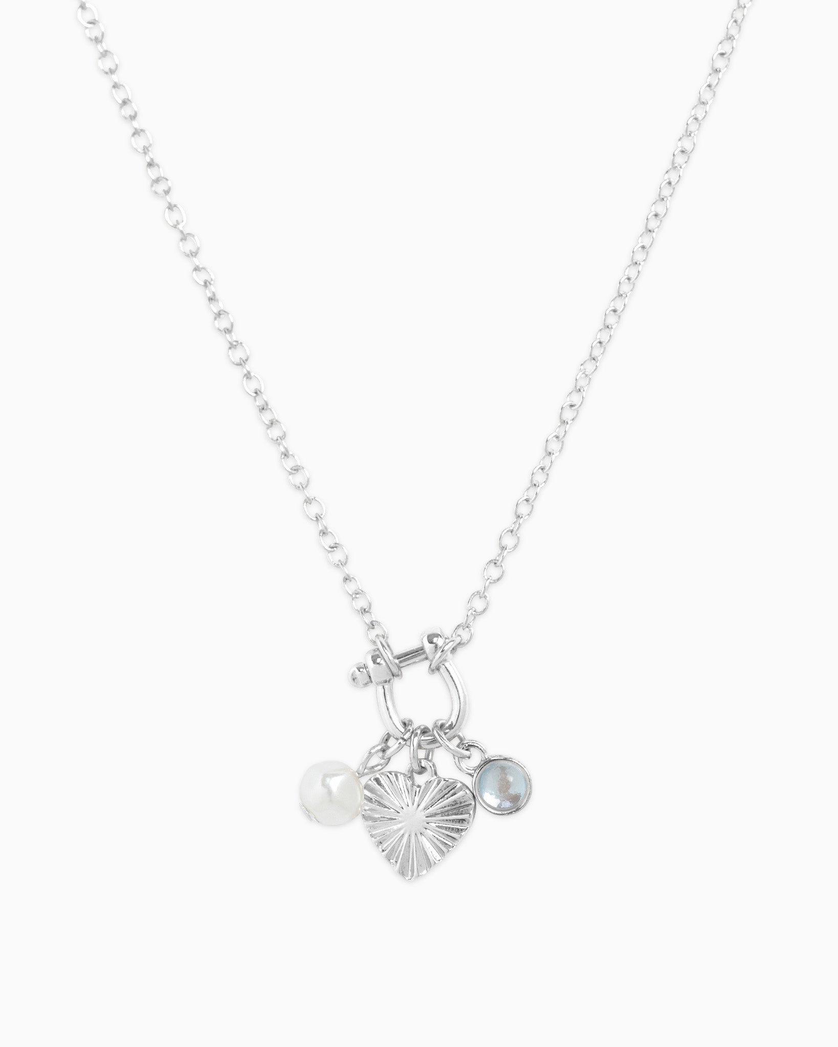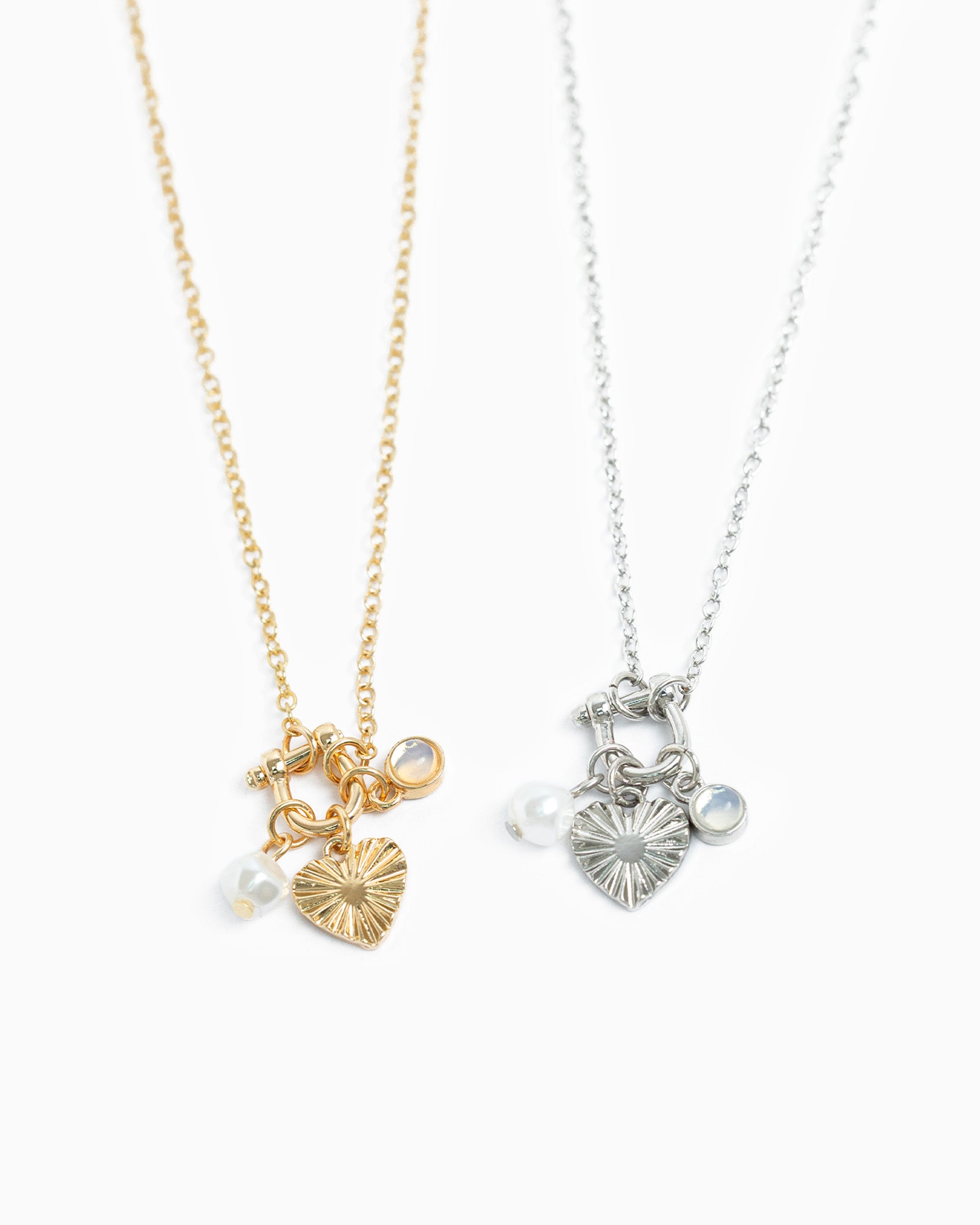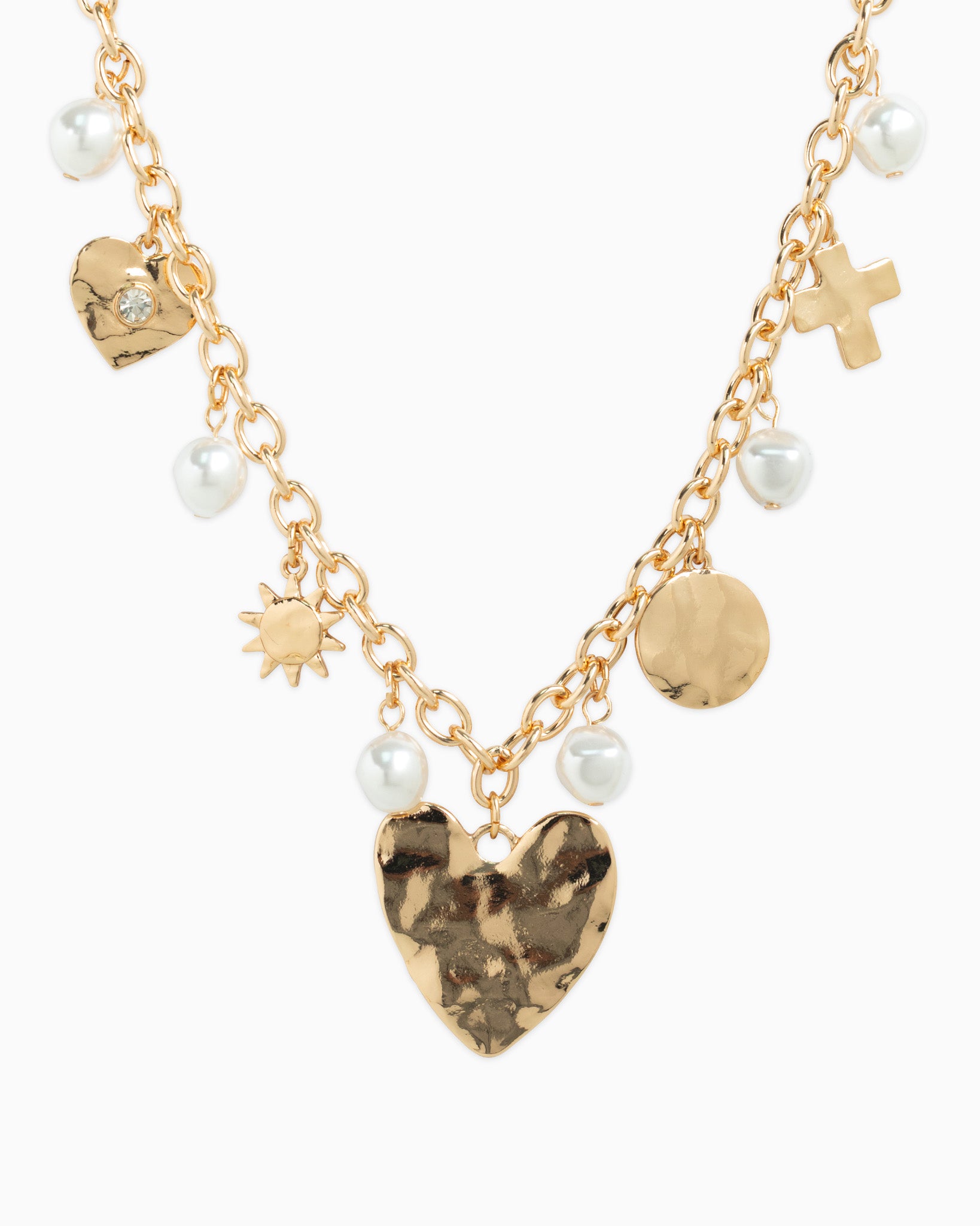 A polished gold horsebit-style carabiner accented with three mini charms — a heart, a textured coin, and a small stone drop.