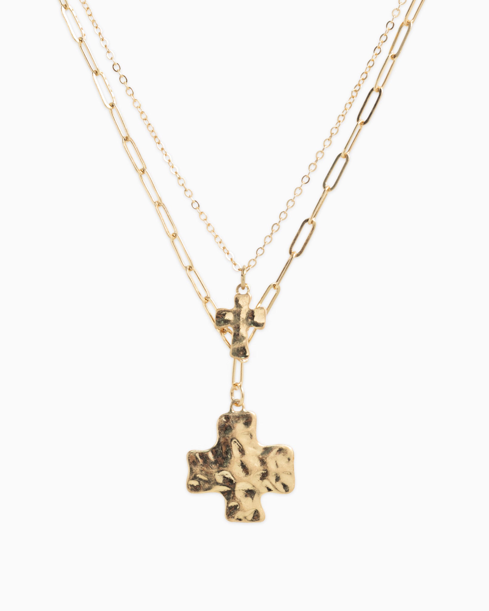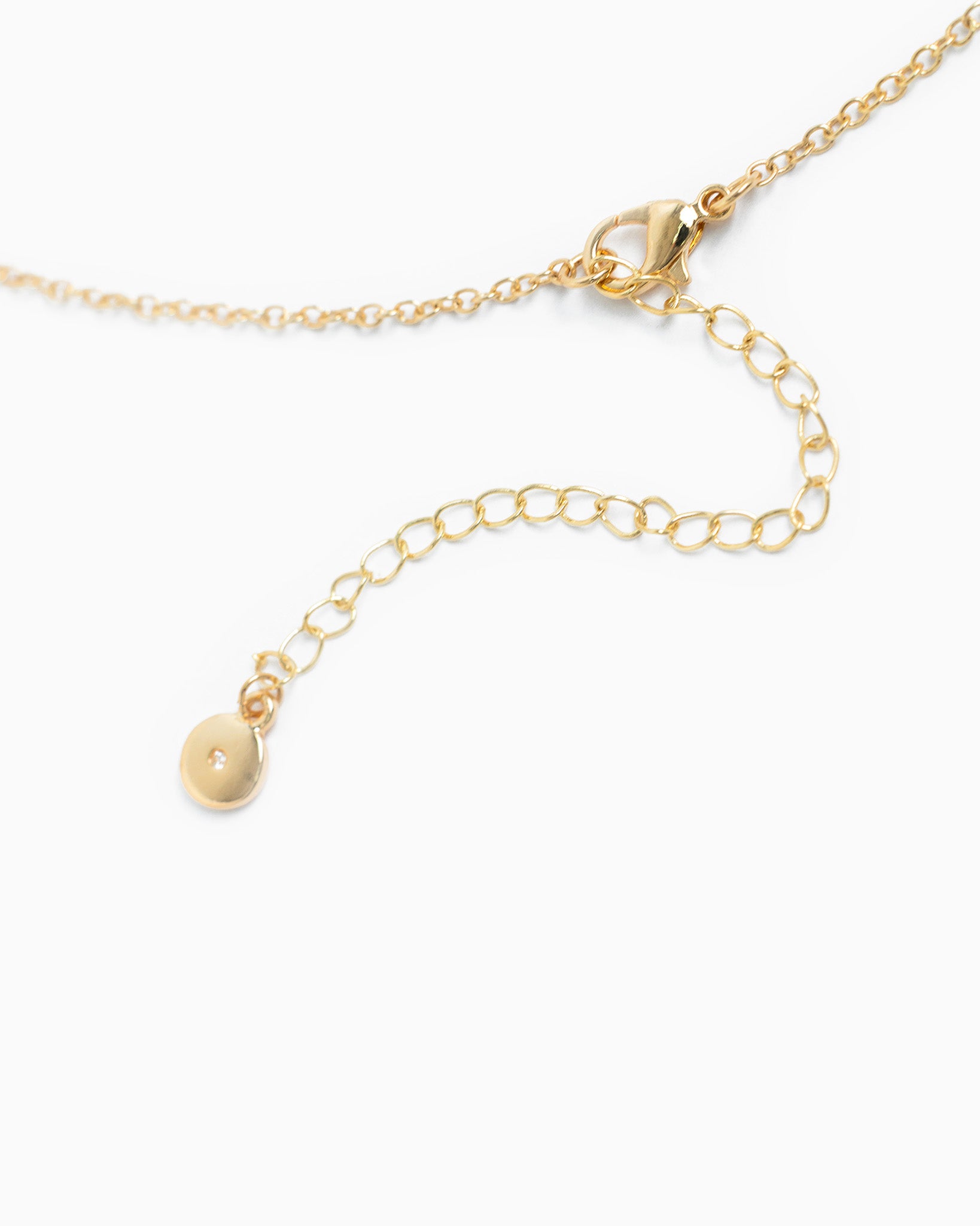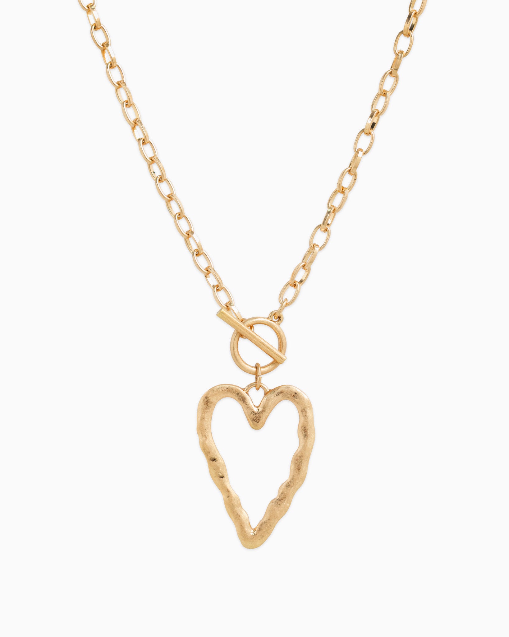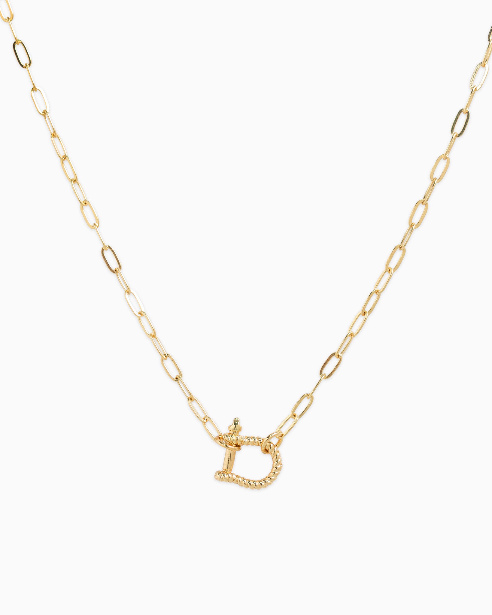 A polished gold horsebit-style carabiner accented with three mini charms — a heart, a textured coin, and a small stone drop.