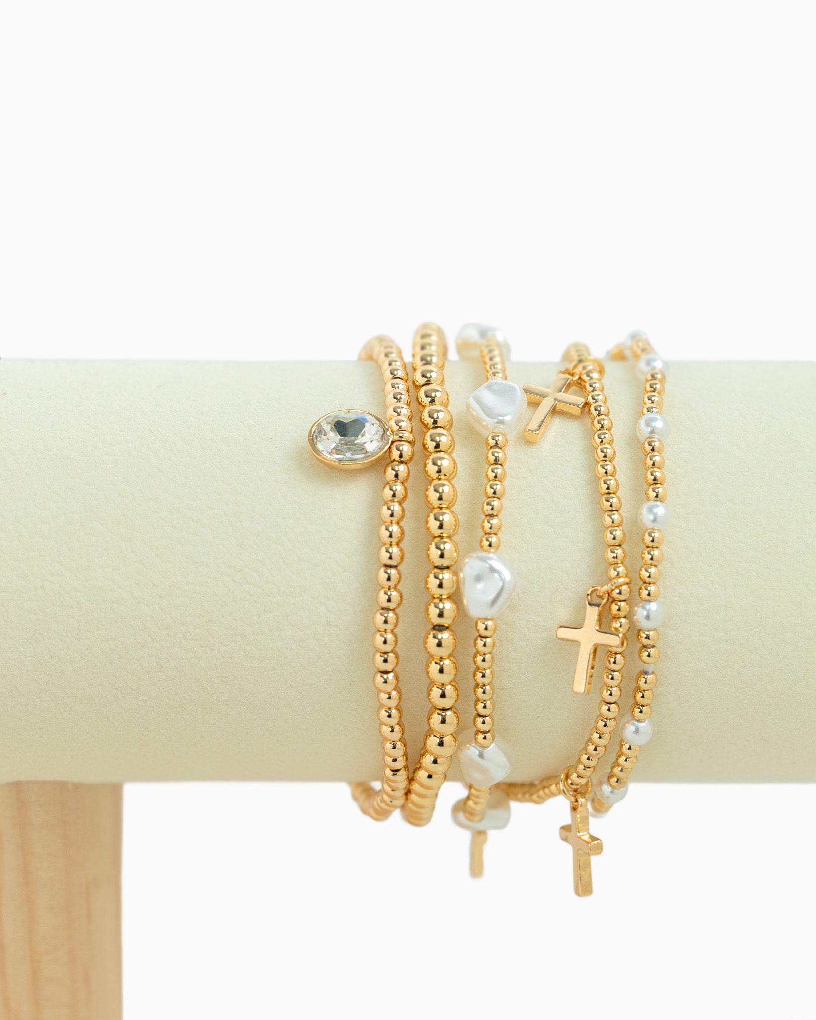 A 5 piece stretch bracelet set featuring polished gold beads, delicate acrylic pearls, and mini cross charms.