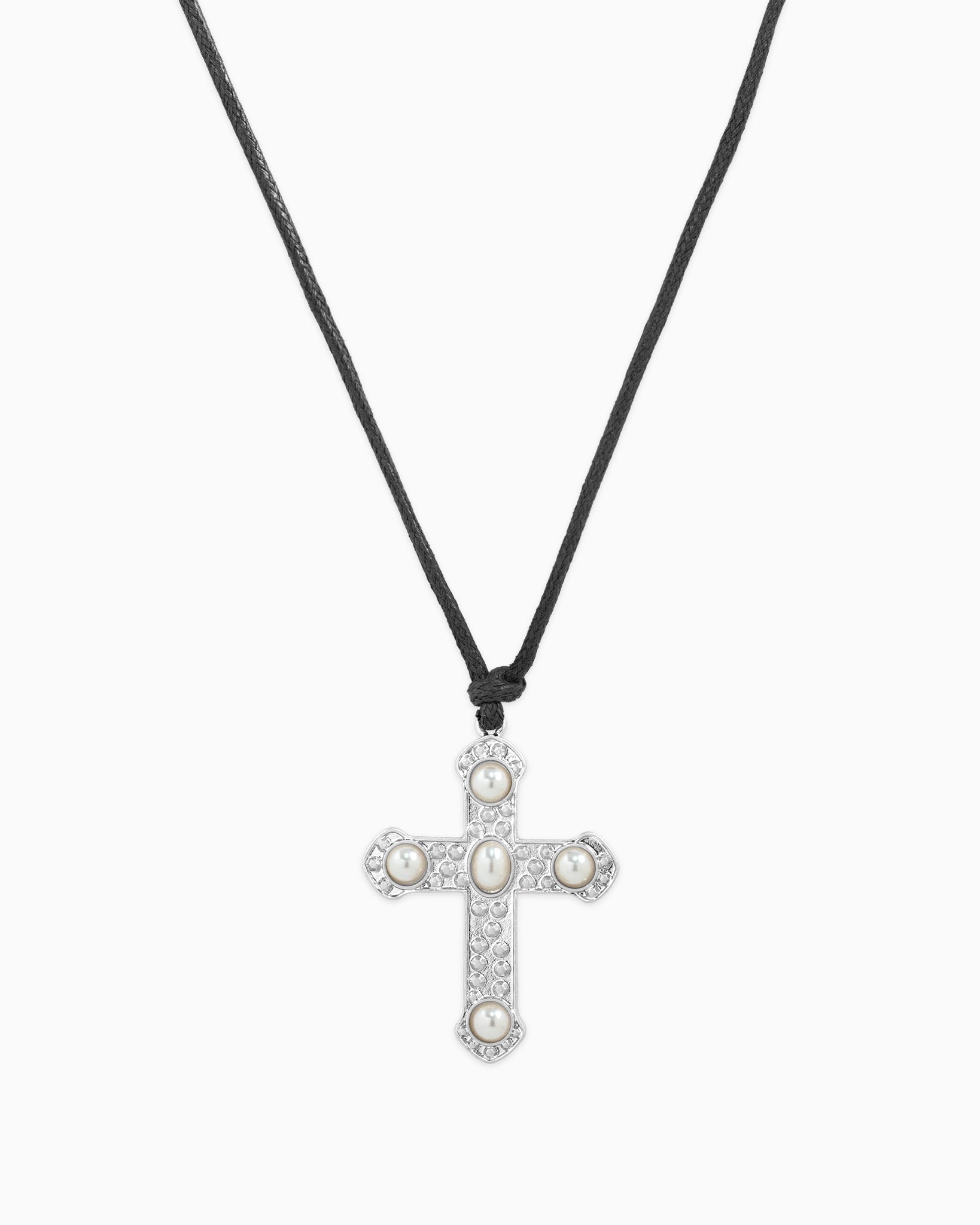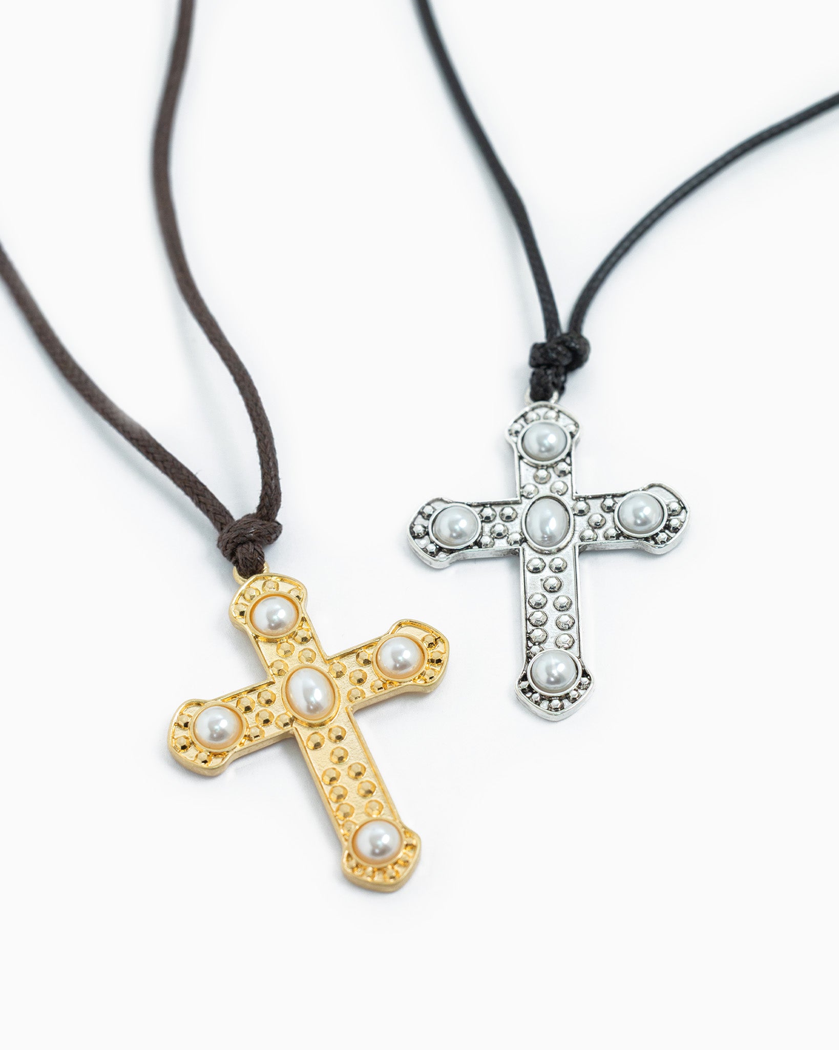 A vintage inspired cross necklace feqturing an antique finish pendant accented with luminous pearl details.