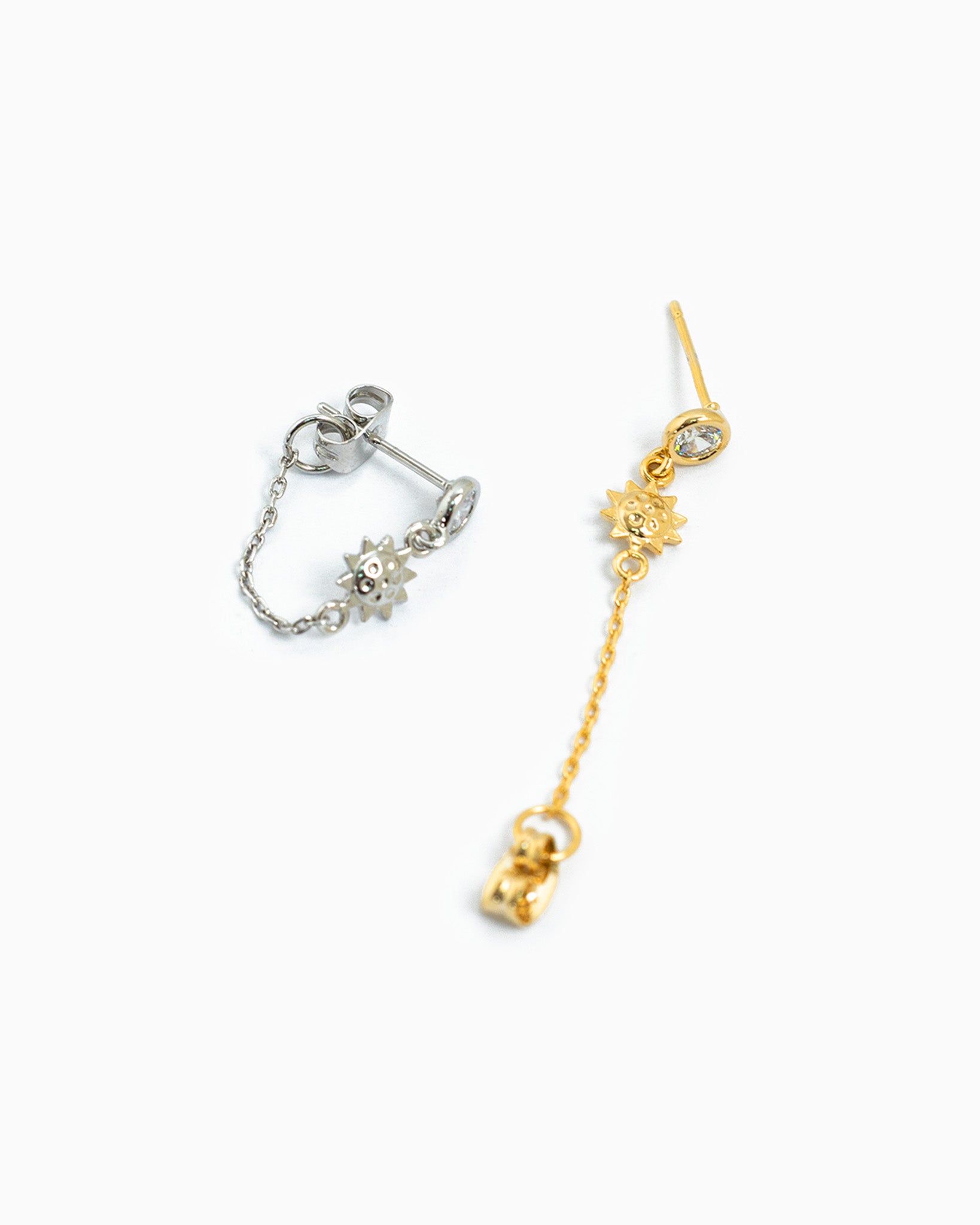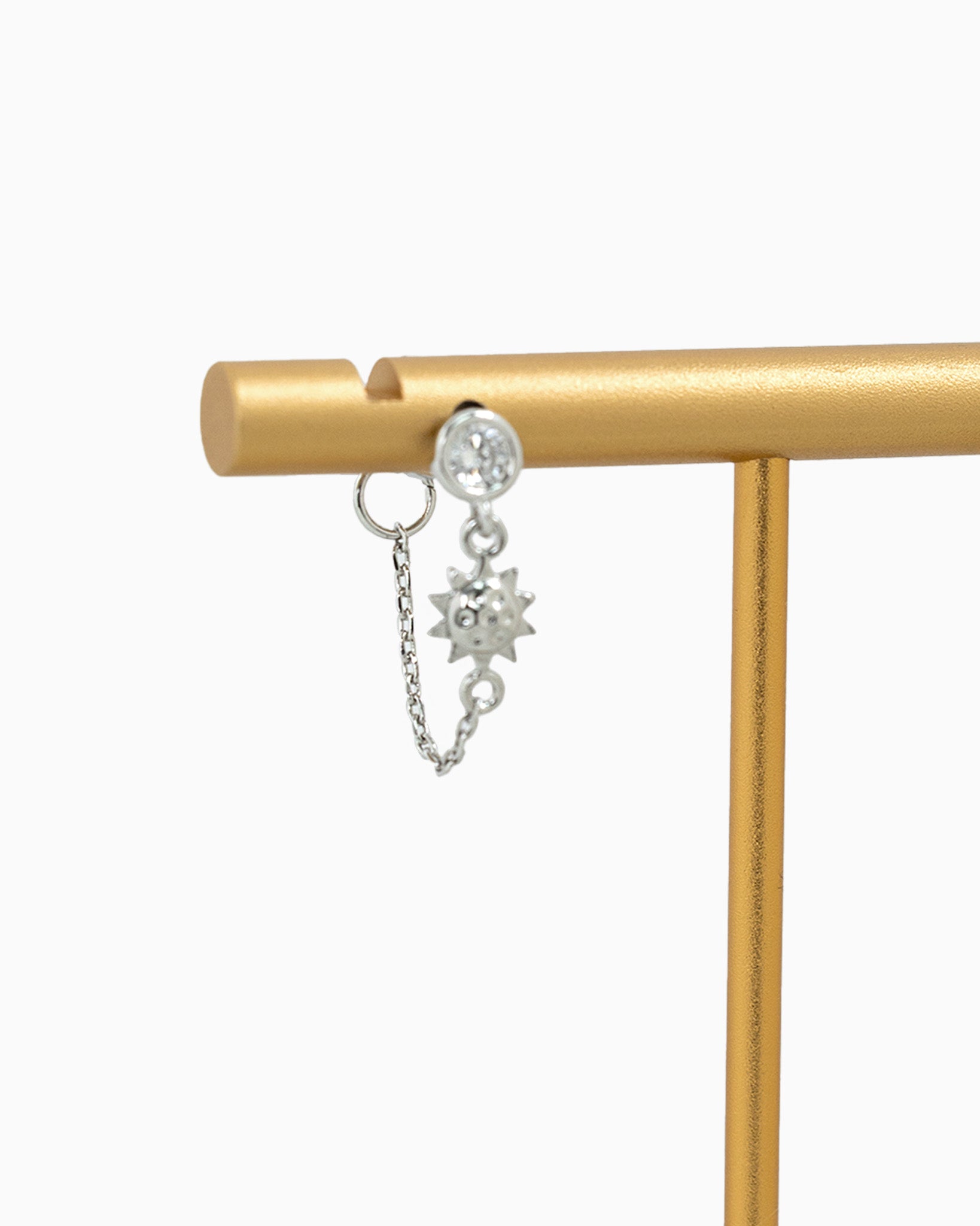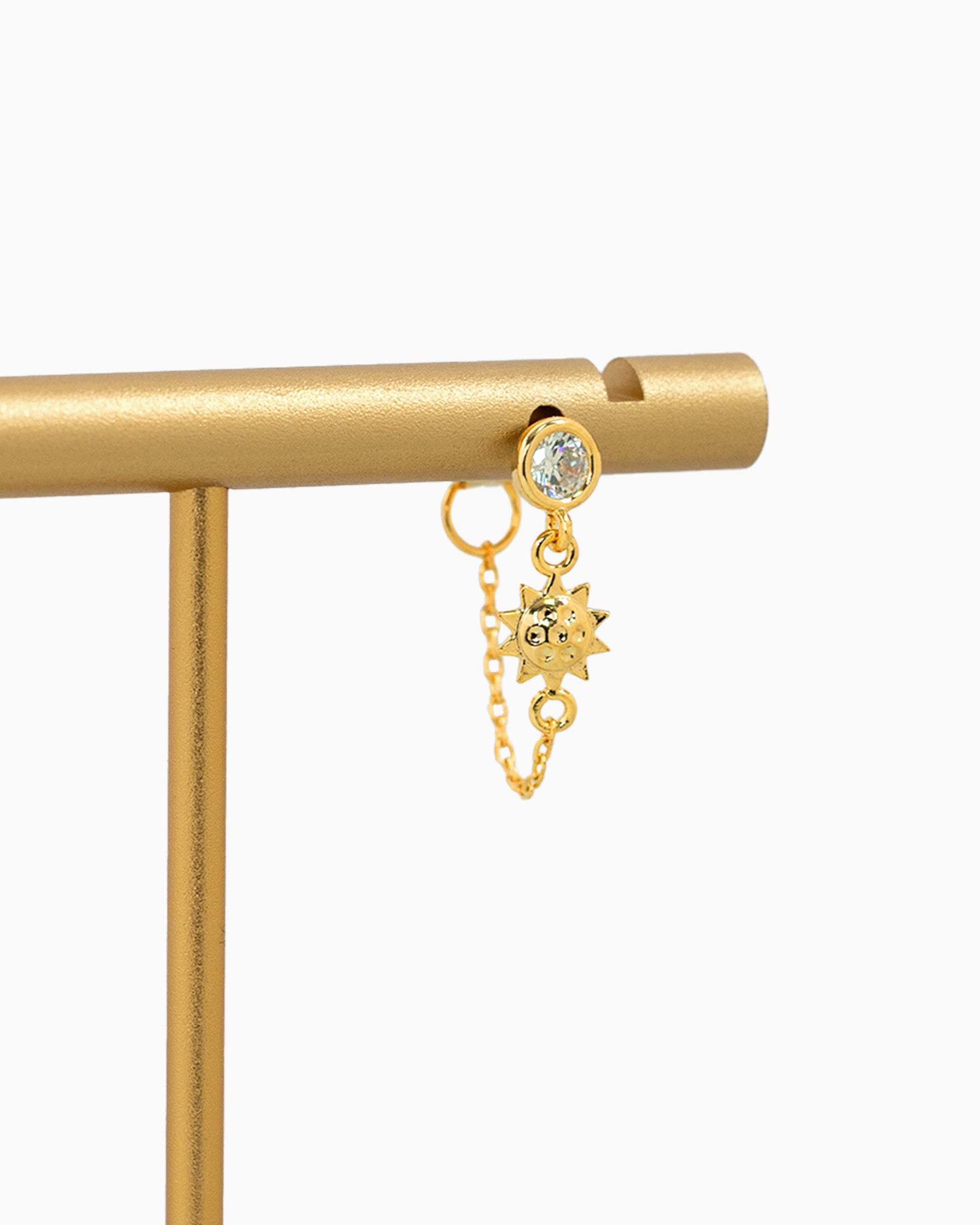 A front-back style drop earring featuring a hammered sun charm and a delicate chain connection.