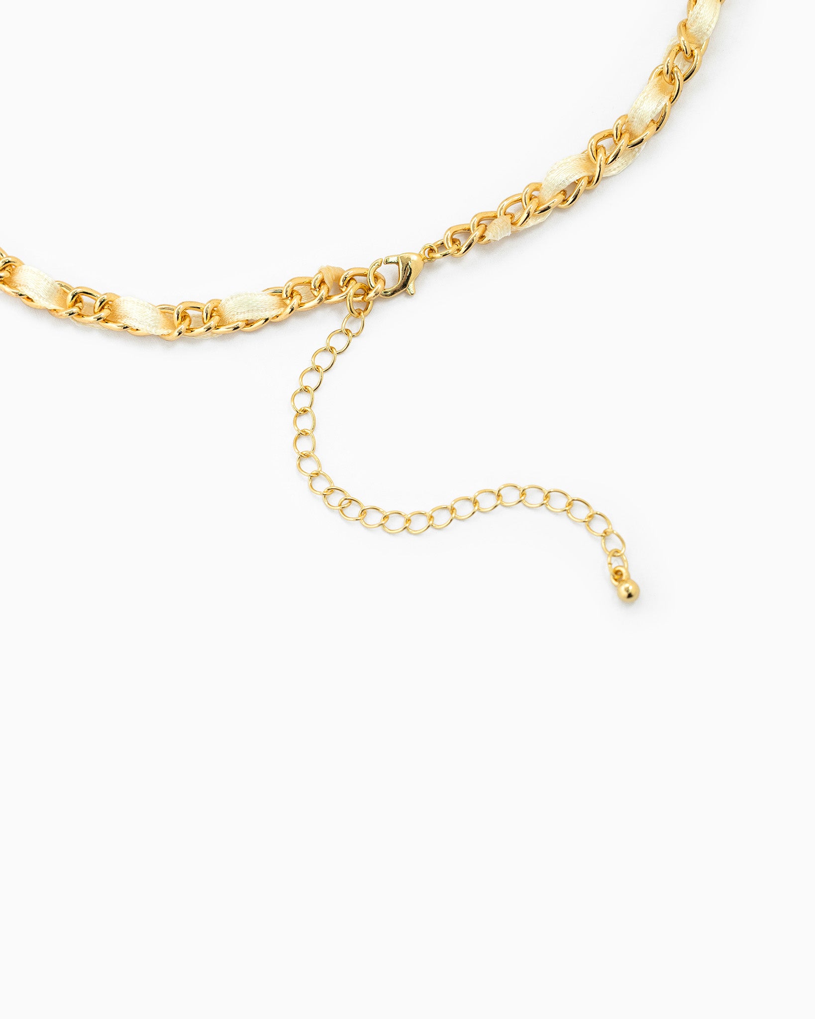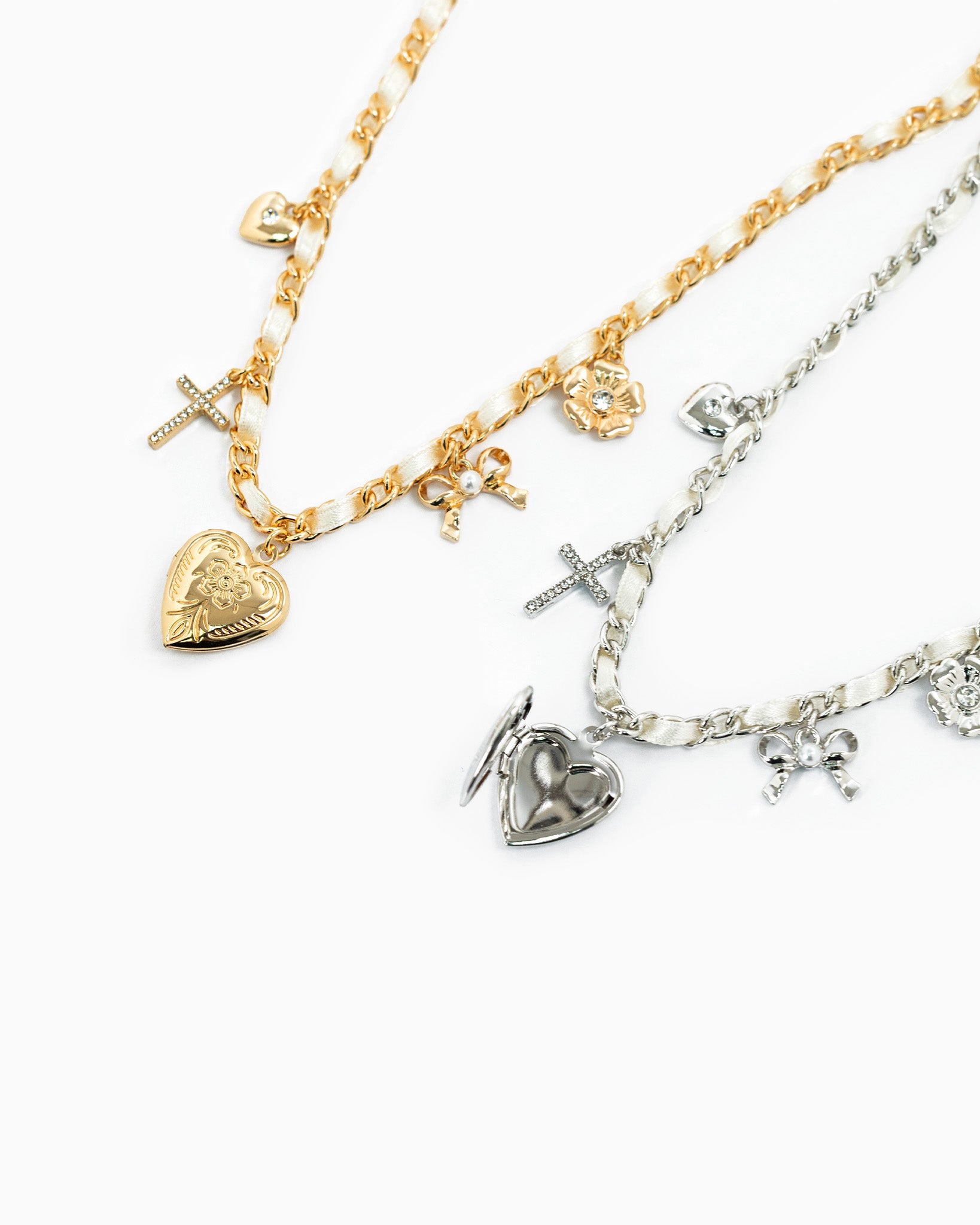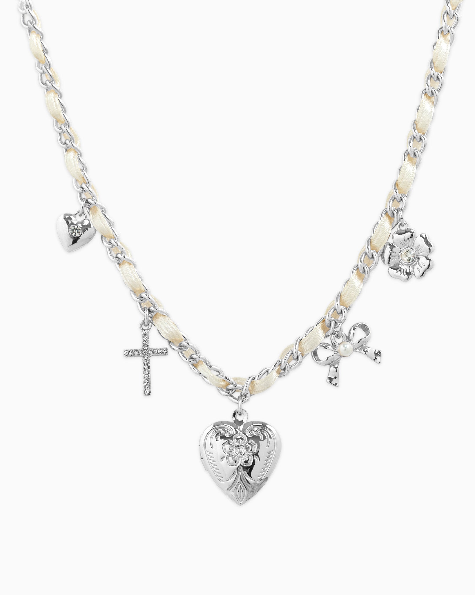 A vintage-inspired necklace featuring a mixed chain with ivory ribbon detailing and five delicate charms, including a heart, cross, flower, and ribbon accents.