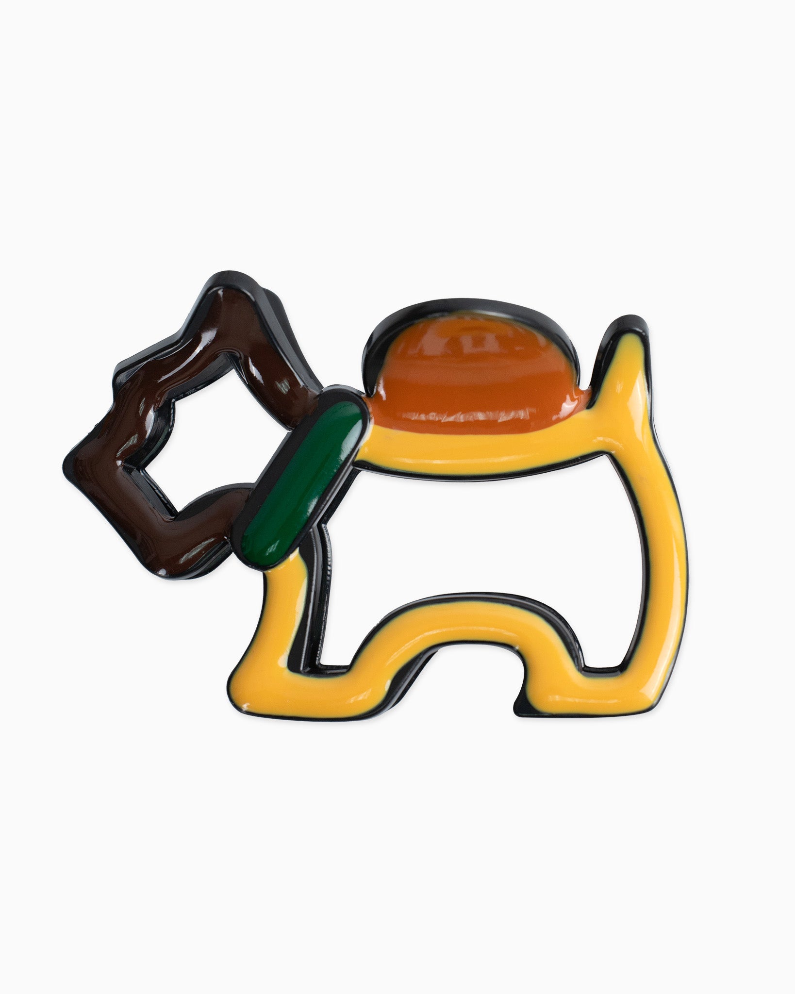 A bold statement hair claw featuring an doggy silhouette design with retro-inspired color blocks in amber, green, and beige. The unique sculptural shape adds a modern artistic edge while providing a strong and secure hold for effortless updos.