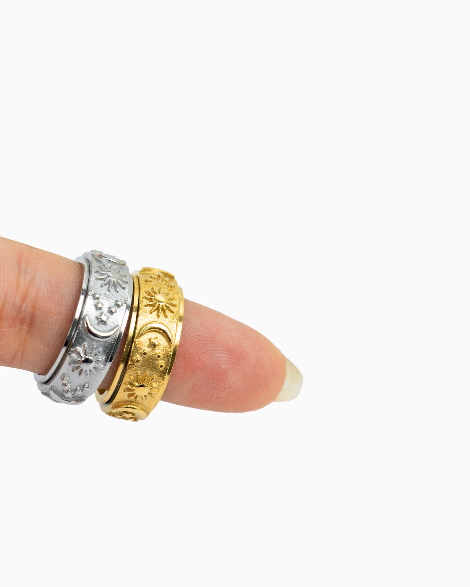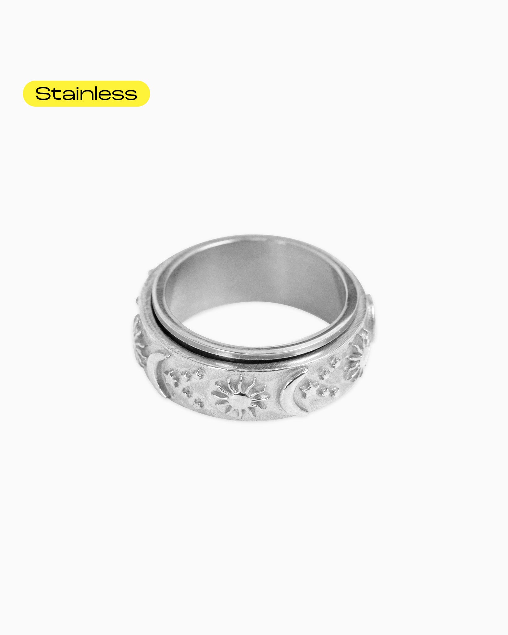 This stainless steel spinning band features engraved sun, moon, and star motifs that rotate smoothly for a soothing, anti-anxiety effect.
