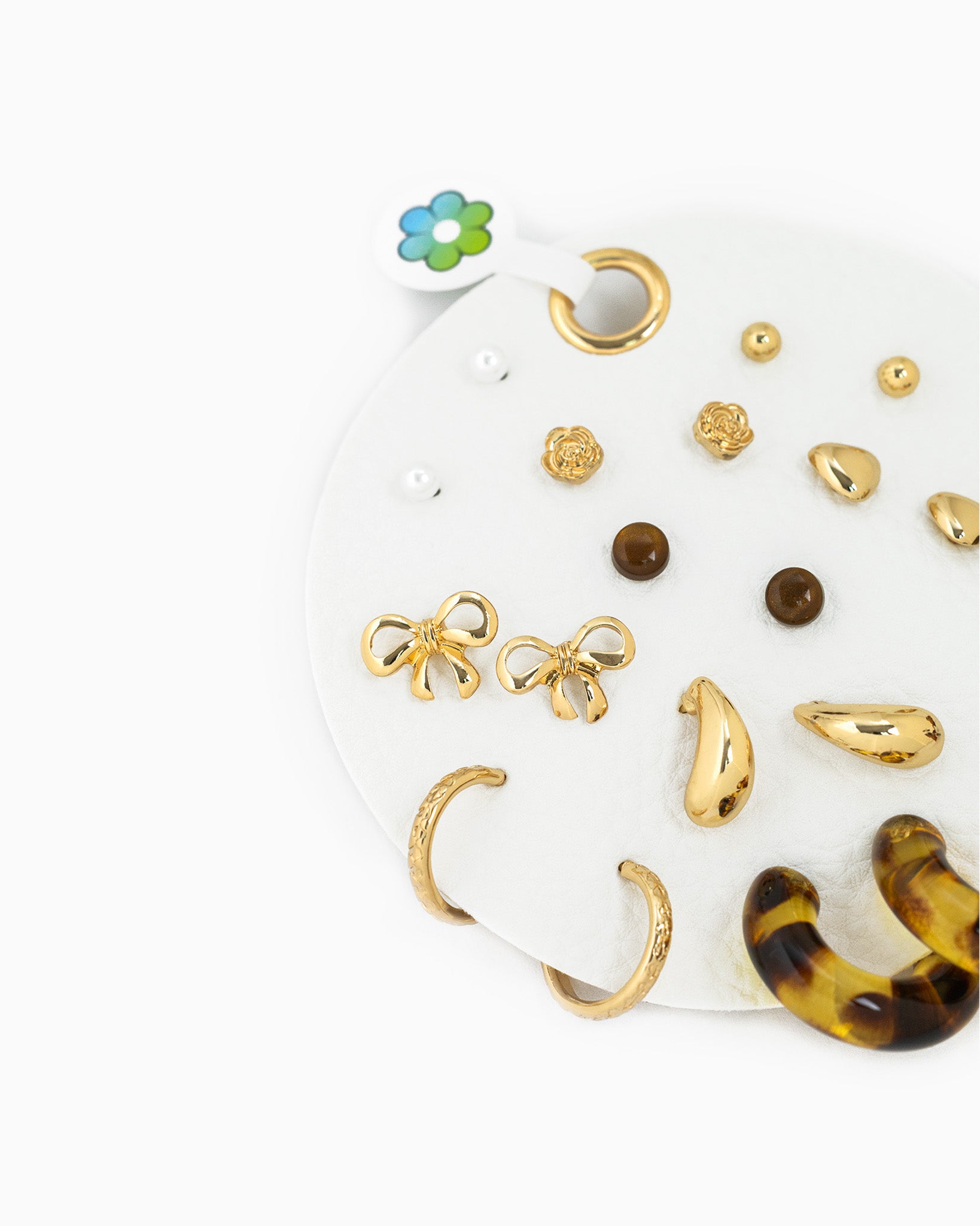Leopard & Gold Mixed Earring Set featuring a stylish collection of 10 pairs in versatile shapes and finishes. This curated set includes leopard-pattern hoops, polished gold teardrops, dainty bows, hearts, pearls, and textured mini hoops — designed to mix, match, and layer effortlessly.