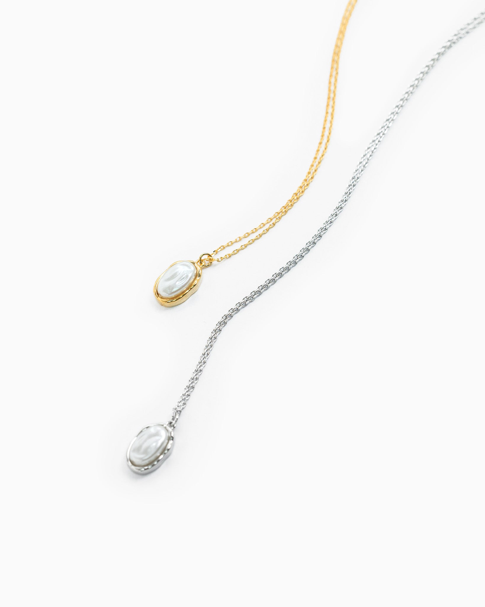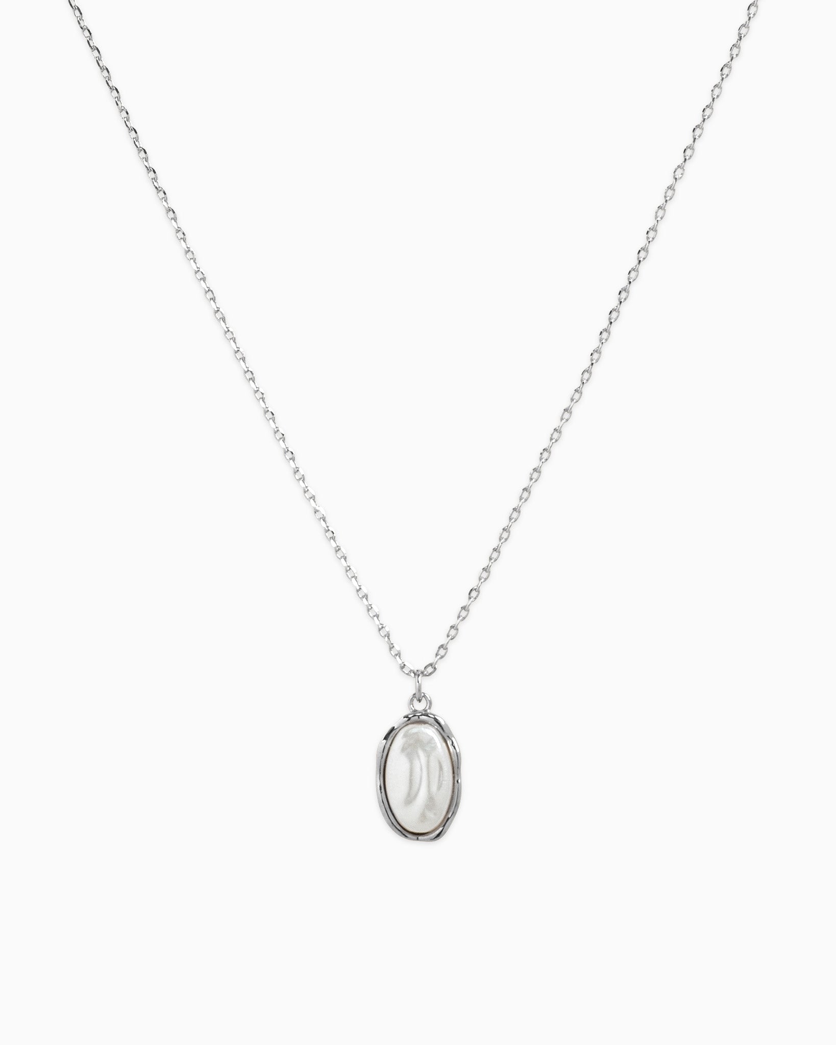 An oval medallion pendant accented with a smooth pearl center and framed in a polished bezel setting.