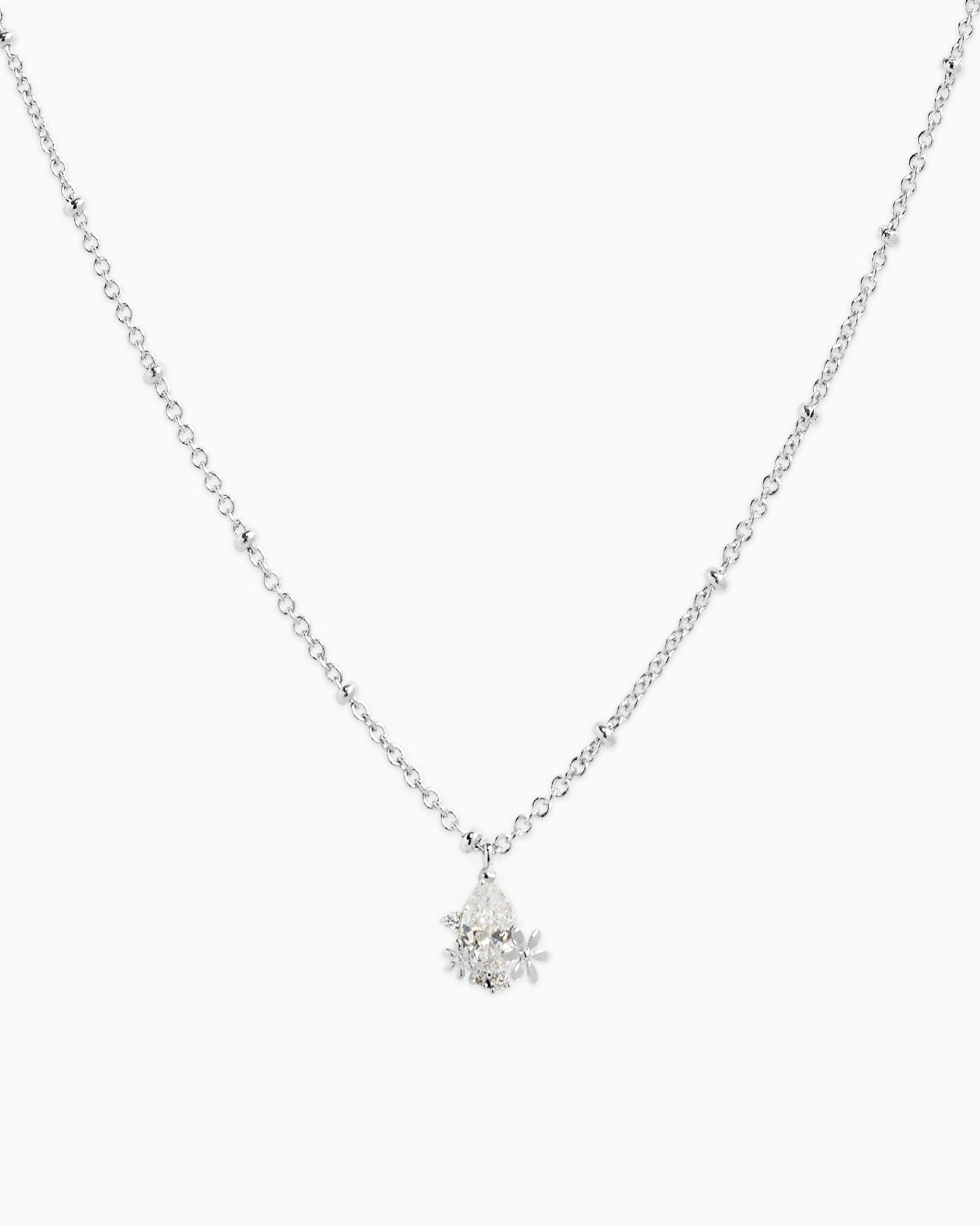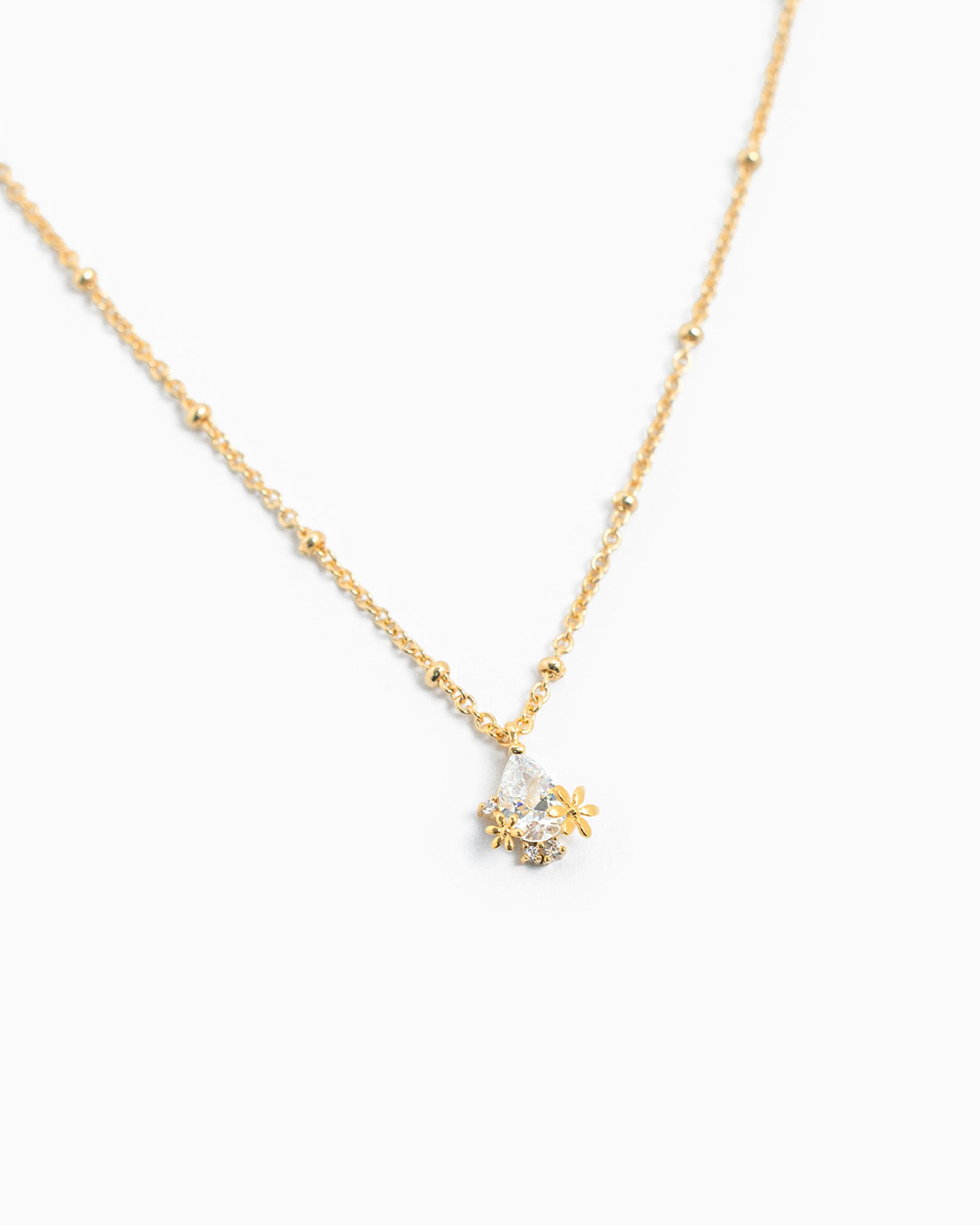 A refined gold necklace featuring a teardrop-shaped crystal framed with delicate flower details.