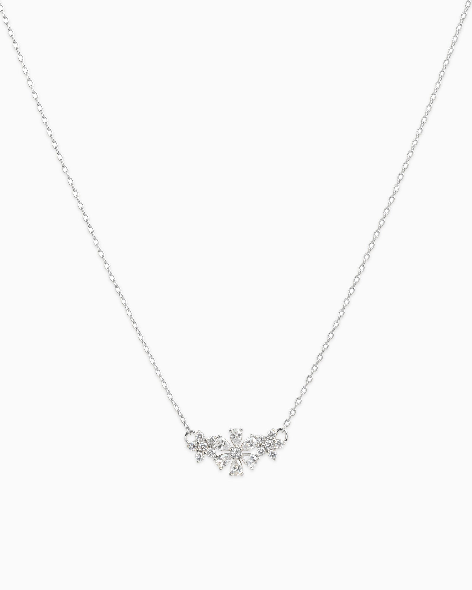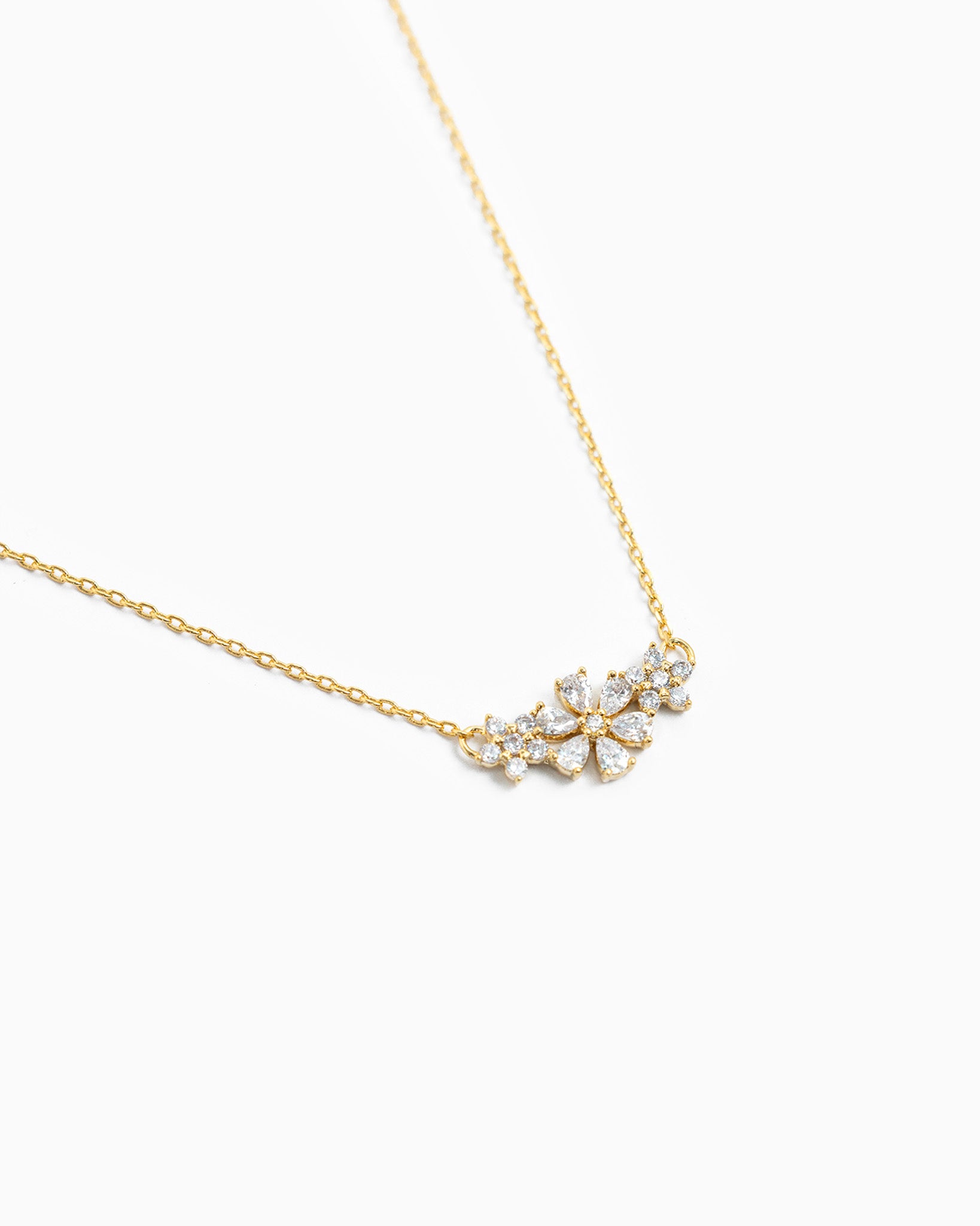A trio of sparkling crystal flowers blooms at the center of this dainty gold necklace. Each petal catches the light beautifully, creating a soft yet radiant shine that complements any look.